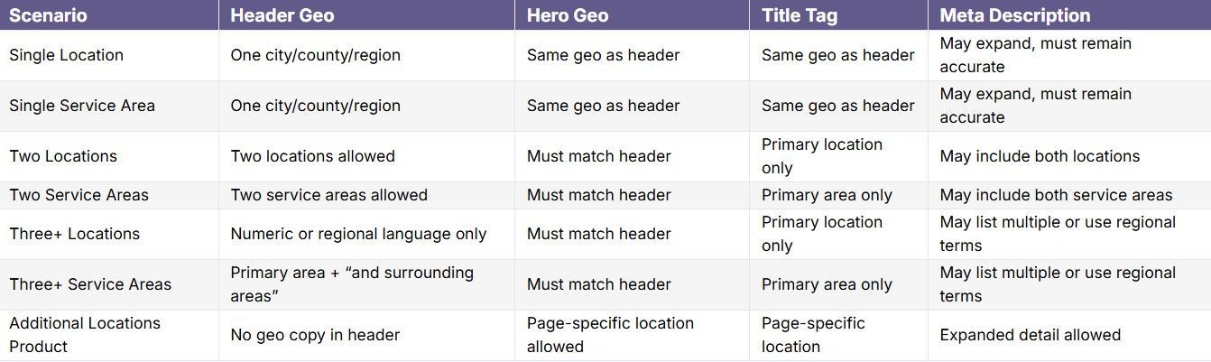 Note: If the client is already ranking locally and local SEO has been added, the header, hero geo reference, and title tag may differ slightly to support those rankings.