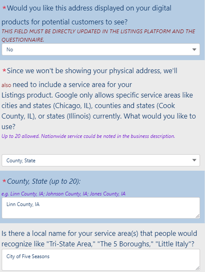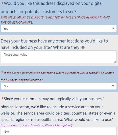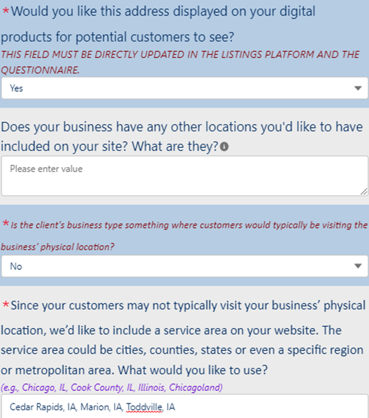 Note: If service area indicated on questionnaire add service area to body copy where applicable.